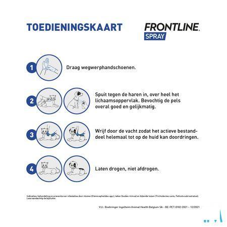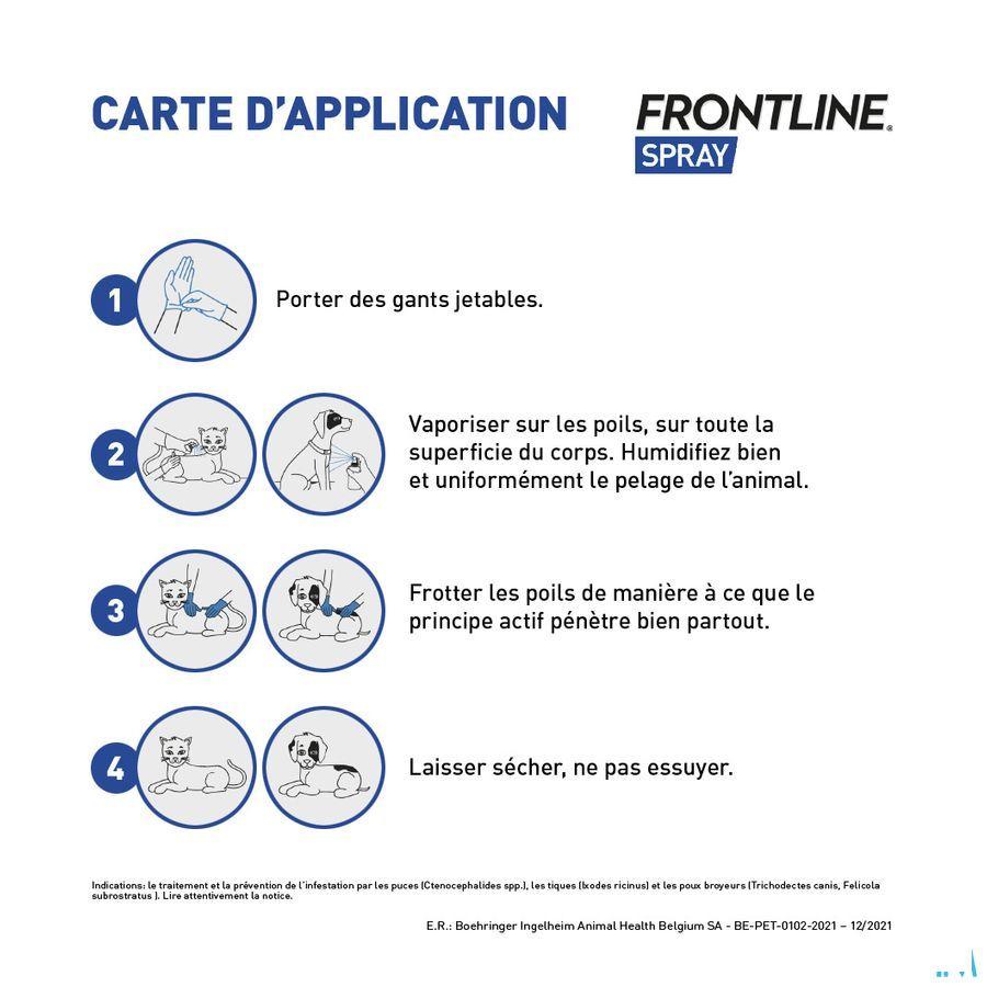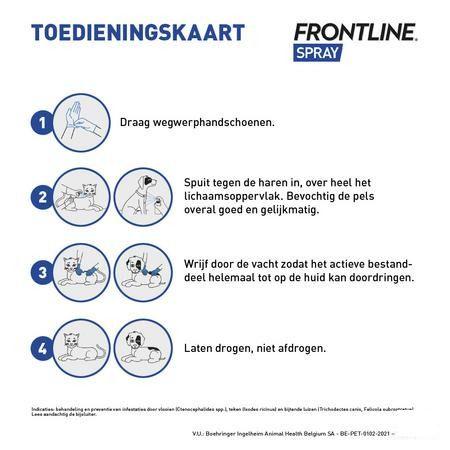 TOEDIENINGSWEG: cutaan gebruik. WIJZE VAN GEBRUIK: tegen de haren in, over heel het lichaamsoppervlak aanbrengen. De pels moet overal goed en gelijkmatig bevochtigd worden. Nadien het diergeneesmiddel inwrijven, zodat het kan doordringen tot op de huid. Laten drogen, niet afdrogen. DOSERING: 7,5 à 15 mg/kg, hetzij 3 tot 6 ml /kg lichaamsgewicht. Dit komt overeen met 2 4verstuivingen/kg voor de flacons van 250 en 500 ml en met 6 12 verstuivingen/kg voor de flacon van 100 ml. De werkingsduur van het diergeneesmiddel bedraagt 3 tot 5 weken tegenover teken en, afhankelijkvan de infestatiedruk, 1 tot 3 maanden tegenover vlooien. De verstuiving legt een beschermende film over de pels en geeft deze een glanzend uitzicht.In afwezigheid van tolerantiestudies is het minimale behandelingsinterval 4 weken.