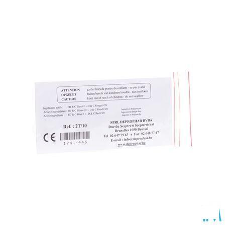 Tweekleurige tandplakverklikker, blauw voor het lokaliseren van de oude tandplak, rood voor de recente tandplak. Fruitsmaak.