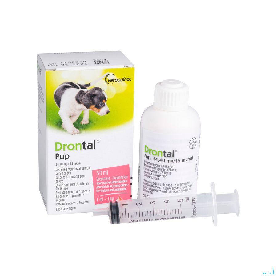DOSERING Eén ml Drontal Pup per één kg lichaamsgewicht. Dit komt overeen met 15 mg febantel en 14,4 mg pyrantelembonaat per kg lichaamsgewicht. WIJZE VAN TOEDIENING Voor orale toediening. De toediening van de suspensie kan gebeuren zowel direct door middel van de bijgevoegde doseerspuit als indirect via vermenging door het voer. Dieetmaatregelen zijn niet vereist. Schudden voor gebruik. BEHANDELINGSDUUR De toediening gebeurt éénmalig per behandeling. Wegens het vroegtijdige optreden van spoelwormbesmettingen (intra-uteriene en galactogene besmetting) moet de behandeling met Drontal Pup reeds vanaf de leeftijd van ca. 2 weken beginnen. Het is aanbevelenswaardig herhalingsbehandelingen uit te voeren met 2 weken tussentijd, tot de leeftijd van 12 weken is bereikt.