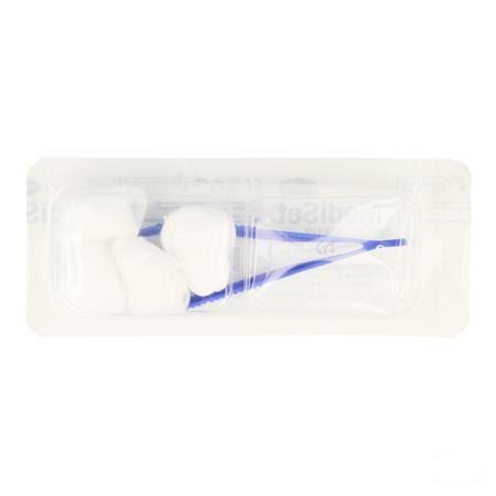 Wondverzorgingsset in een harde blister, 2 compartimenten: - Kan als tray gebruikt worden - Compartimenten voor ontsmettingsmiddel of vloeistof Inhoud: 1 Anatomisch pincet polypropyleen 12,5 cm blauw 4 Gaasdeppers, M3 pruim