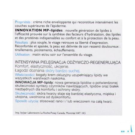 Bijzonder goed smeerbare en voedende crème die de bovenste lagen van de opperhuid intensief herstelt. INNOVATIE MP-lipidenEen nieuwe generatie lipiden met een bewezen effectieve invloed op de aanmaak van hydratatiefactoren, lipiden en proteïnen die onmisbaar zijn voor een prettig aanvoelende en beschermde huid. COSMEDIA SP, een textuurgevend actief, zorgt voor een zeer prettig gevoel bij het aanbrengen van de crème. Het fusiepunt van de crème is identiek aan de huidtemperatuur, wat een sensationeel gevoel geeft alsof de crème op de huid smelt.