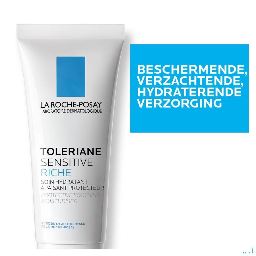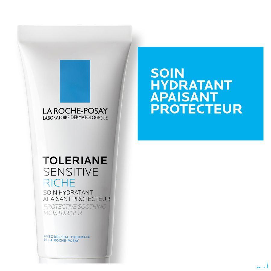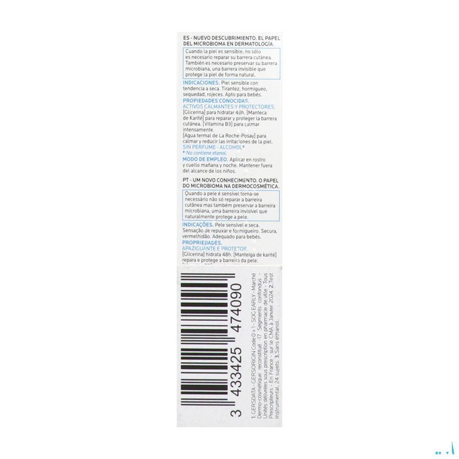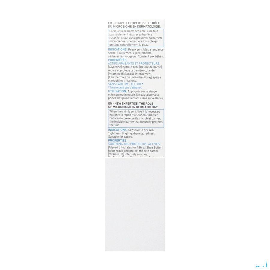 Voor gevoelige huid. Trekkend, tintelend, droog gevoel, soms roodheid. BESCHERMENDE, VERZACHTENDE HYDRATERENDE VERZORGING Verzachtende en beschermende werkstoffen: [Glycerine] Hydrateert 48 uur. [Karitéboter] Herstelt en beschermt de huidbarrière. [Vitamine B3] Verzacht intens. [La Roche-Posay Thermaal Water] Verzacht en vermindert huidirritaties. Complementaire ingrediënten om comfortabel aanbrengen te garanderen en de kwaliteit van de formule te vrijwaren. Zonder parfum. Zonder alcohol. Niet-comedogeen. Niet-irriterend/Maakt niet gevoelig.