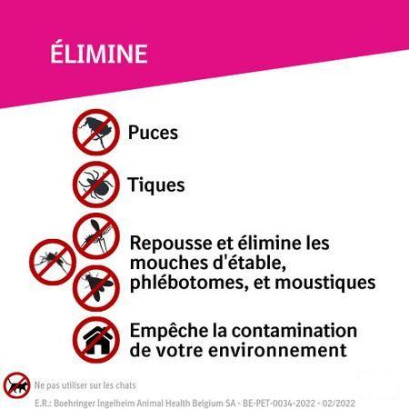 Indicaties: Bij honden voor de behandeling en preventie van infestaties met vlooien en/of teken, wanneer afwerende (anti-voedende) werking nodig is tegen zandvliegen, bijtende vliegen en/of muggen: Vlooien: Behandeling en preventie van infestaties met Ctenocephalides felis vlooien en preventie van infestaties met Ctenocephalides canis vlooien. Een éénmalige behandeling voorkomt nieuwe infestaties met vlooien gedurende 4 weken. Teken: Behandeling en preventie van infestaties met teken (Dermacentor reticulatus, Ixodes ricinus, Rhipicephalus sanguineus). Eén behandeling doodt (Dermacentor reticulatus, Ixodes ricinus, Rhipicephalus sanguineus) en weert (Ixodes ricinus, Rhipicephalus sanguineus) teken gedurende 4 weken na behandeling, en weert Dermacentor reticulatus vanaf 7 dagen tot 4 weken na behandeling. Muggen en zandvliegen: Weert (anti-voedende werking) zandvliegen (Phlebotomus perniciosus) gedurende 3 weken en muggen (Culex pipiens, Aedes albopictus) gedurende 4 weken. Doodt zandvliegen (Phlebotomus perniciosus) en muggen (Aedes albopictus) gedurende 3 weken. Stalvliegen: Weert (anti-voedende werking) en doodt stalvliegen (Stomoxys calcitrans) gedurende 5 weken.