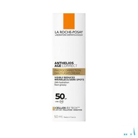 Anthelios Age Correct SPF50 zonbescherming is een zonnecrème tegen rimpels en donkere vlekjes voor het gezicht met een zeer hoge SPF 50 UVA/UVB-bescherming. De crème helpt de tekenen van huidveroudering in 4 weken verkomen en verminderen door fijne lijntjes en rimpels op te vullen en de fysiologische mechanismen van huidvernieuwing te stimuleren. De zonnecrème biedt ook bescherming tegen vervuiling (door de aanhechting van vervuilende deeltjes op de huid te beperken) en bescherming tegen oxidatie (door oxidatieve stress veroorzaakt door vervuiling en infrarood te voorkomen).