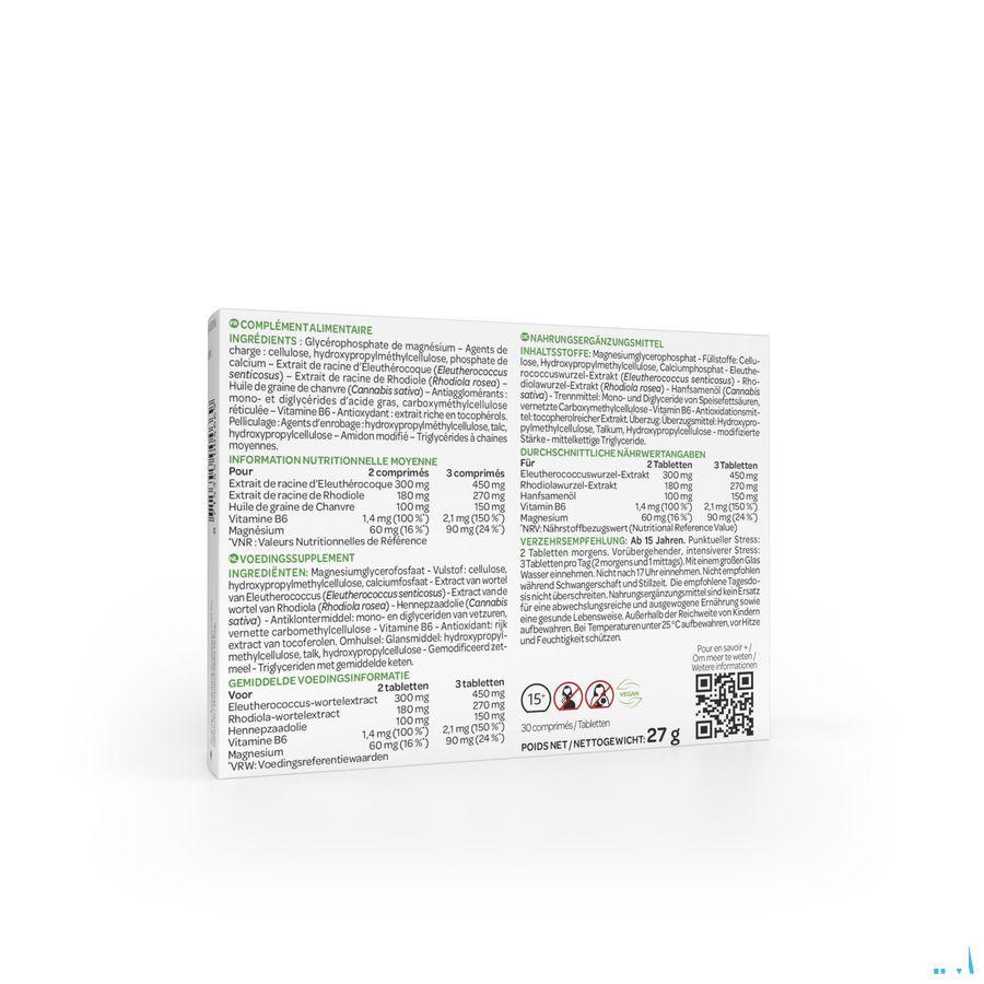 INGREDIËNTEN: Magnesiumglycerofosfaat - Vulstof : cellulose, hydroxypropylmethylcellulose, calciumfosfaat - Extract van wortel van Eleutherococcus (Eleutherococcus senticosus) - Extract van de wortel van Rhodiola (Rhodiola rosea) - Hennepzaadolie (Cannabis sativa) -Antiklontermiddel: mono- en diglyceriden van vetzuren, vernette carbomethylcellulose - Vitamine B6 - Antioxidant: rijk extract van tocoferolen. Omhulsel: Glansmiddel: hydroxypropylmethylcellulose, talk, hydroxypropylcellulose - Gemodifi ceerd zetmeel - Triglyceriden met gemiddelde keten. Gemiddelde voedingsinformatie 2 tabletten 3 tabletten Extract van de wortel van Eleutherococcus Equivalent droge wortel 300 mg 3 mg 450 mg 4,5 mg Extract van de wortel van Rhodiola Equivalent droge wortel 180 mg 900 mg 270 mg 1350 mg Hennepzaadolie 100 mg 150 mg Vitamine B6 1,4 mg (100 % **) 2,1 mg (150 % **) Magnesium 60 mg (16 % **) 90 mg (24 % **) **VRW: Voedingswaardereferentie